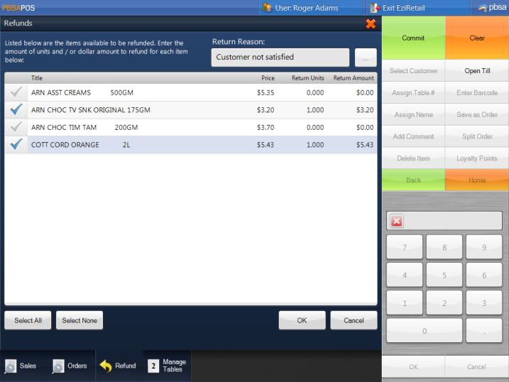 To complete a refund if the customer has a receipt you search for the sale via the receipt number and then select the sale. Now click the refund button and select the items you want to refund. If you want to do a refund without knowing the reciept you simply add the items you want to refund and then click the refund button.