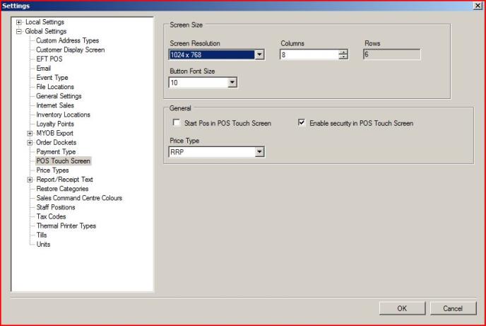 Then navigate to "POS Touch Screen" and choose your screen resolution which is generally 1024 X 786 for a touch screen. On making your selection this will set the recommended number of columns. You can alter this but you will need to check when you open the touch screen how this looks. Sometimes you may find that you need to switch the screen resolution back and forward between the options 1024 X 768 and 1280 X 1024.