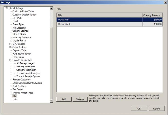 A. Go to Tills under global settings and click the add button and then enter a description for the till location and enter an opening balance. You need a till for each PC/Touch screen that you will be using in your store.