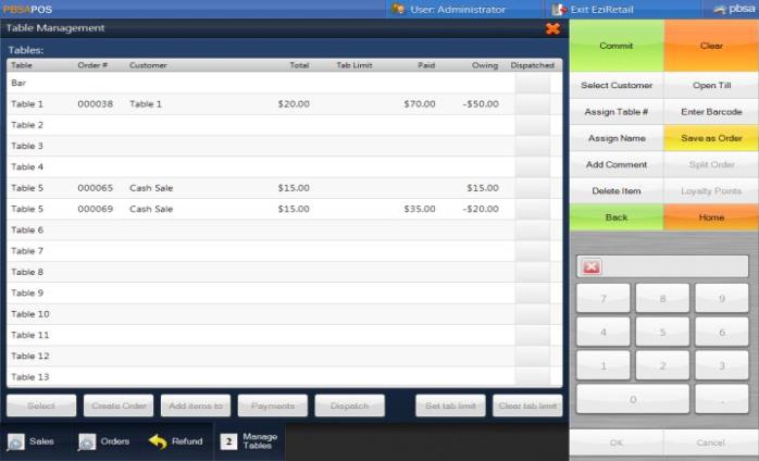 You can view all orders (sit down, phone and delivery) by clicking the orders button at the bottom of the screen. You can select any order and take payment on the order, you can also just dispatch the order without payment. You can select an order and alter the order by adding or adjusting or removing items. You can also view sales via the sales button.To view orders linked with tables or a bar tab, click the "Manage tables" button. Once an order has been paid for and disptached it will no longer appear as an order but it will now be a sale and can be searched for by clicking the sale button.