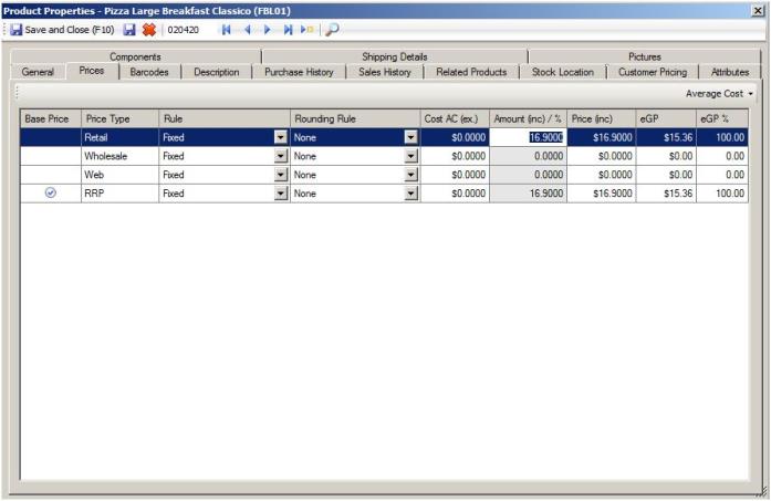 For most touch screen operations all you need to do is go to the prices tab and click on the retail price row in the "Amount (inc) / %" column and enter your price for this product which will be used in PBSA POS Touch.